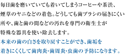 歯科衛生士の施術により専用の器具使用し、歯に着いた歯垢(プラーク)や歯石を除去します。